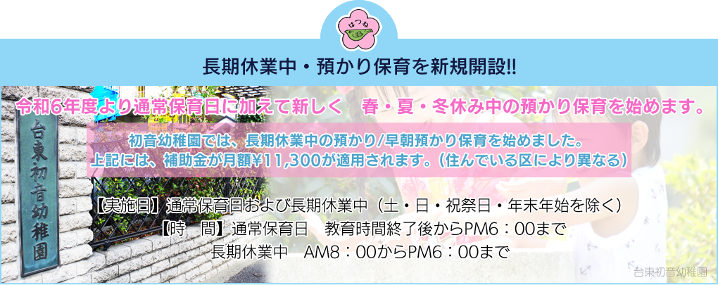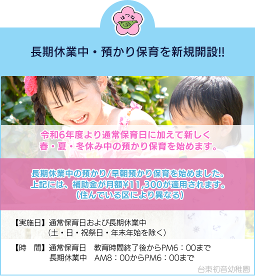 当園では、園内の見学ができる「見学会」と、ご入園をいただく前に体験入園ができる「はつねルーム」を開催しております。