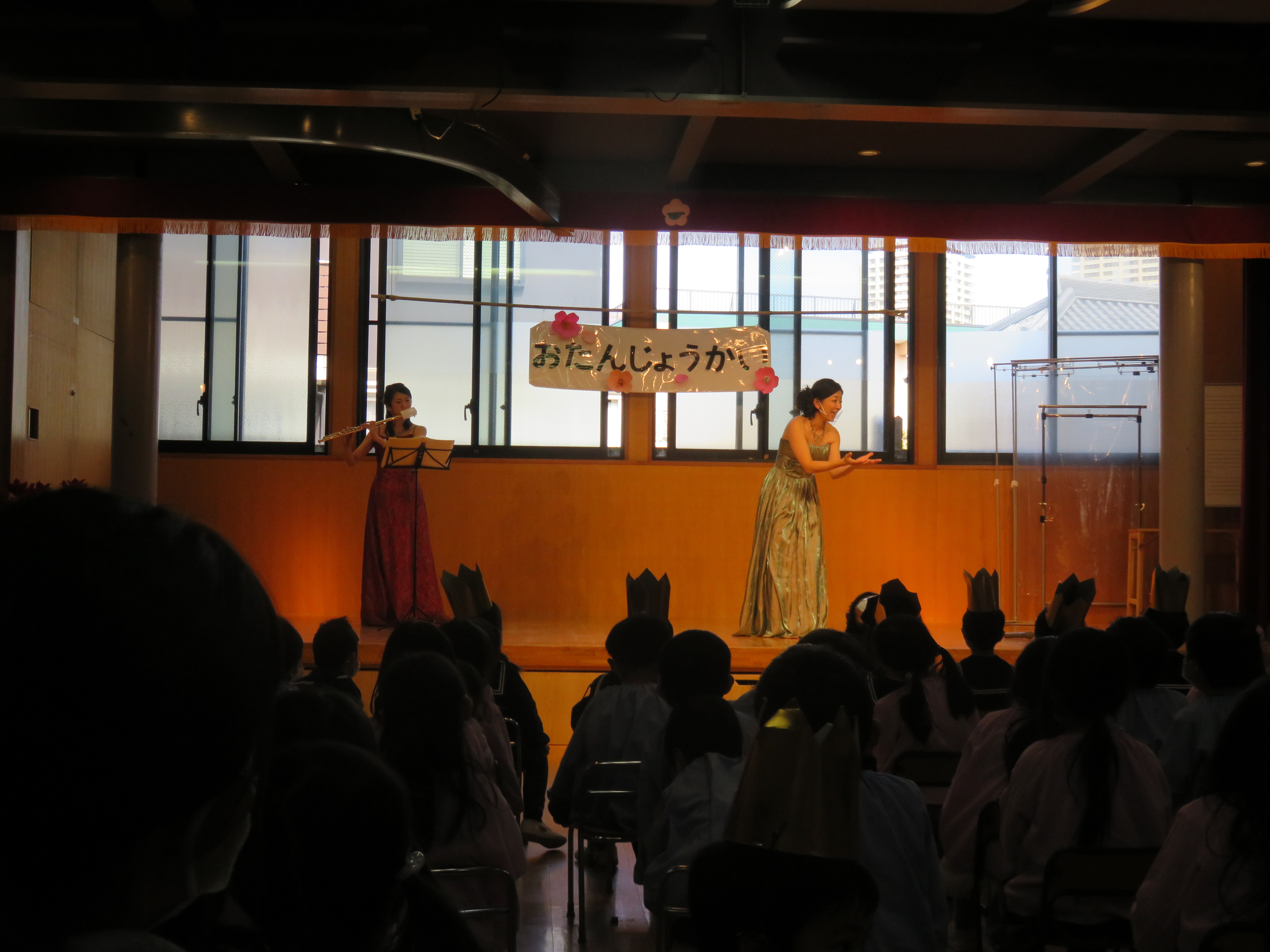 歌のプレゼントでは、先日のリズム会でも素晴らしい発表をしたさくら組が林あずさ作曲の「ハッピーバースデー」を歌いました。歌の先生からのプレゼントはフルート奏者と、ピアニスト、ソプラノ歌手の3人の先生たちが、素敵な舞台をプレゼントしてくださいました。最後の先生からのプレゼントは、誕生日をお祝いしに駆け付けてくださいましたお父様たちも特別ゲストとして参加して頂いた「ももたろう~鬼滅バージョン」を発表しました。最後は園長扮する「キブツジ」が大暴れ。鬼退治に集まったお父様たちの活躍で鬼たちは一目散。終始、子ども達の歓声があふれる楽しい会となりました。急遽ご協力いただきましたお父様、お忙しい中お集まりいただきました保護者の皆様ありがとうございました!!