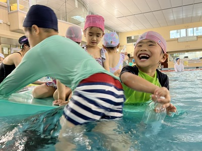 5月12日(木)、5月19日(木)年長、年中の子ども達が正課の体育活動として「清島プール」へ行きました。幼稚園で夏季に行うプール活動と大きく異なることはなんといっても大きなプール。事前に入水の際の注意事項や、マナーなどをしっかりと確認し、マイクロバスでクラスごとにプールへ向かいました。プール活動指導は体操の内堀先生と園長先生、担任の先生の3名で行いました。習い事でプールに通っているお友達も多く、潜ることが出来たり、バタ足が出来る事を教えてくれる子もいました。大きなプールで少し緊張しながらも先生の話をききながら活動に参加することが出来ました。6月にも清島プールでのプール活動があります。次回は今回の活動よりステップアップした内容になる予定です。子どもたちと「プールって楽しい!!」と感じられるような体験になる様に工夫していきます。登園は全員徒歩ということで、ご協力いただきました事本当にありがとうございました!!